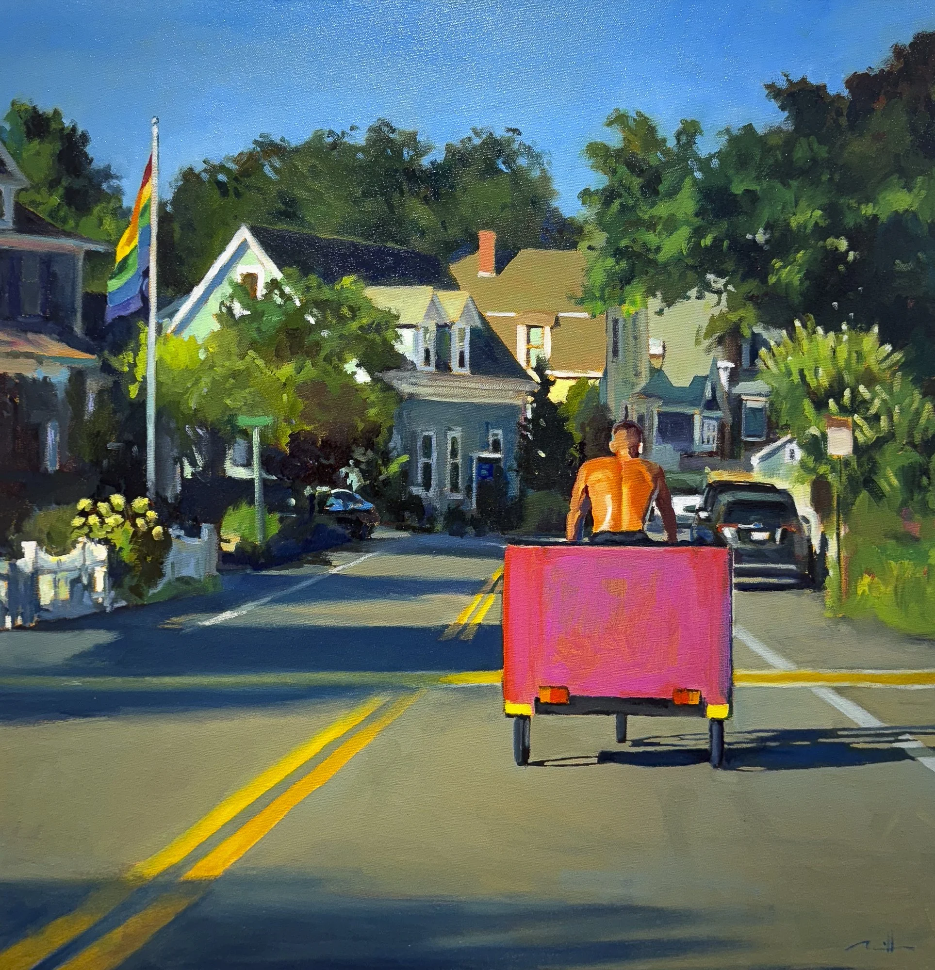 His work transcends traditional genres, focusing not on portraits or landscapes but on the essence of a scene, where shadows and a masterful sense of color bring everyday moments to life. Sun Days highlights his fascination with Provincetown’s pedicab community—a vibrant yet often overlooked subculture, primarily composed of J1 visa students from Bulgaria, who form a vital thread in the town’s cultural fabric. Lyons transforms the ordinary, including the utilitarian pedicab, into something extraordinary, inviting viewers to notice beauty in the overlooked.